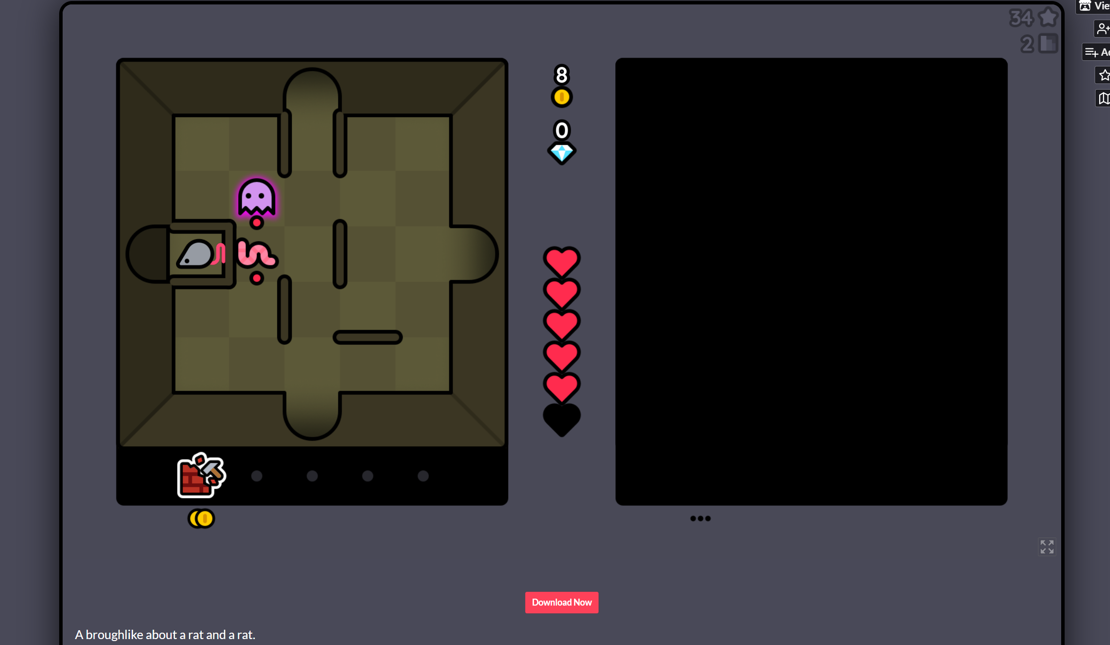 It's nice and cute but... The challenge is not very satisfying. Buying items is necessary as the enemies become quickly stronger, so you have to explore, to collect coins, but sometimes you just can't avoid being trapped. The enemies are smart and wait for you while they are close and on the same square color. That way they become a constraint on up to two directions on four total. Some more constraints, which easily happens, and you have to lose a heart. So with bad luck you lose heart over time, while spending time exploring is necessary. At the end I feel like I have to try repeatedly until some good luck let me go further than usual...